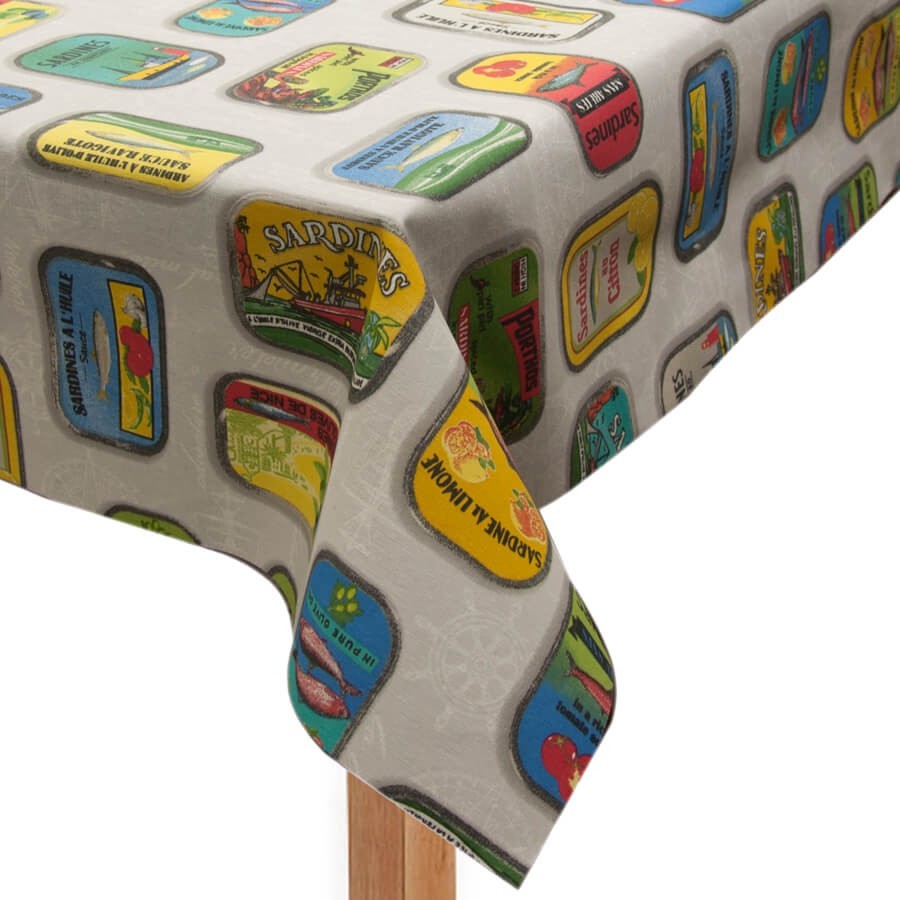 Mantel al corte antimanchas con bonitos diseños de latas de sardina.